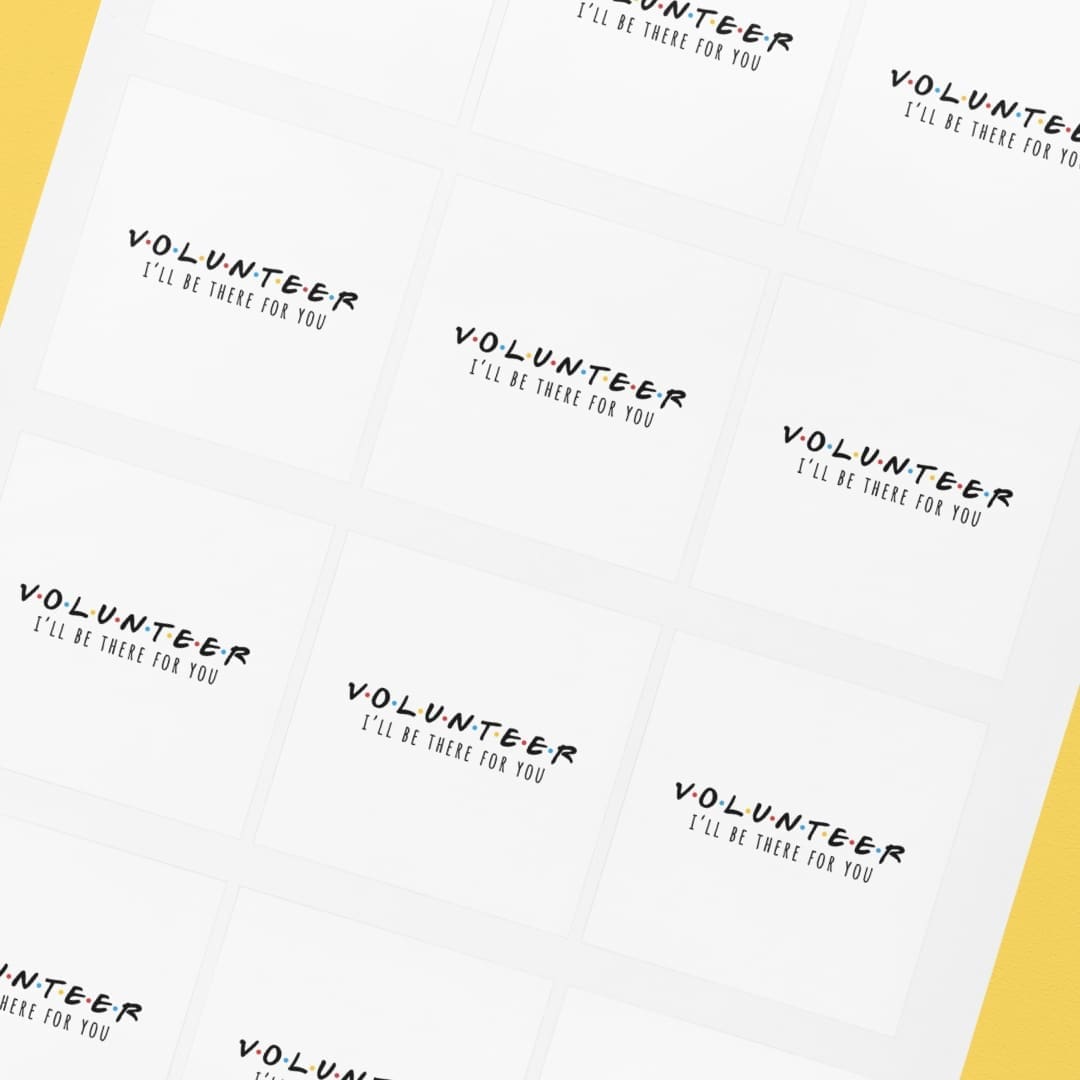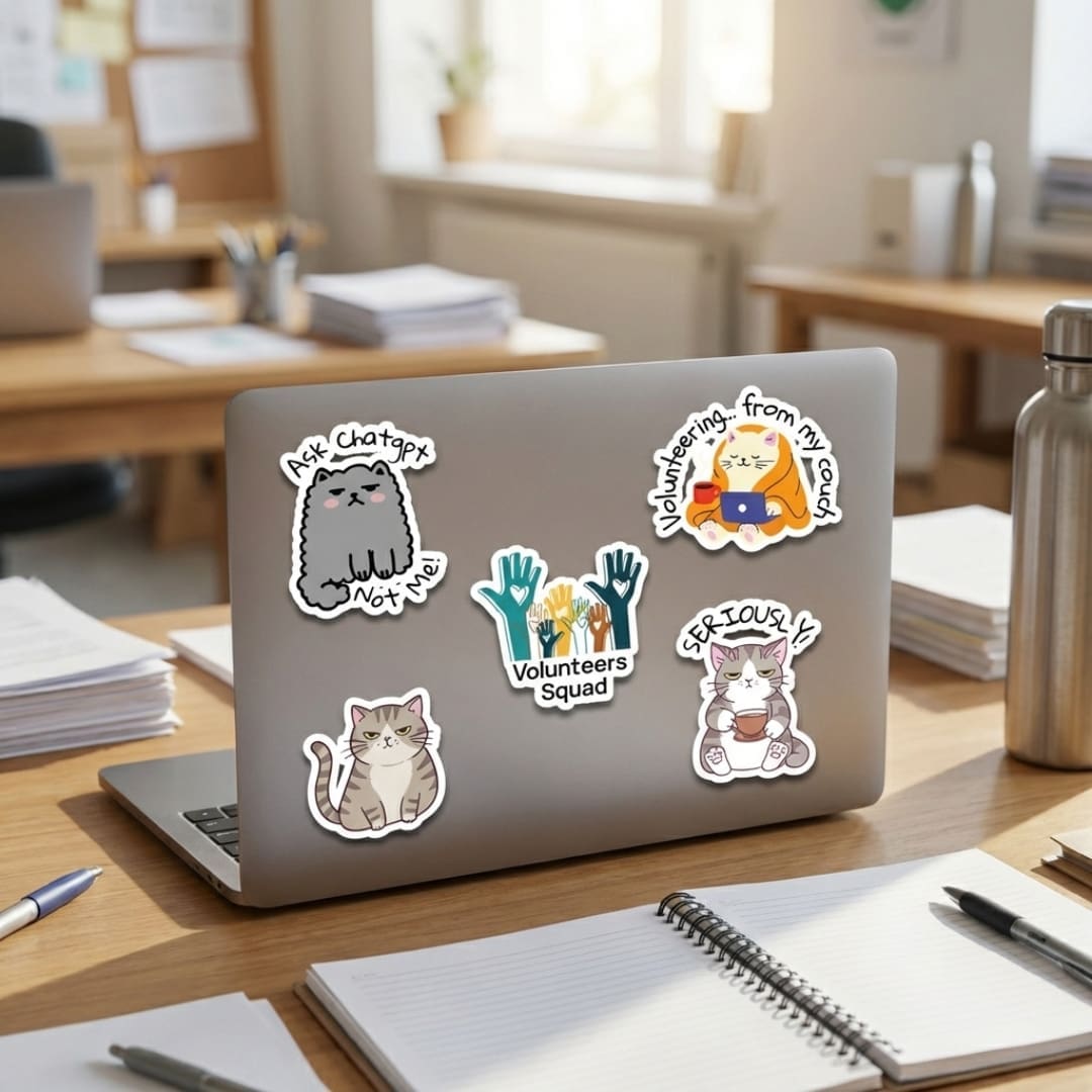 These stickers are not just decoration, they’re a mood. They’re the “Volunteers Are Here” energy. They’re the silent scream behind every organized event. They’re for the people who always show up.