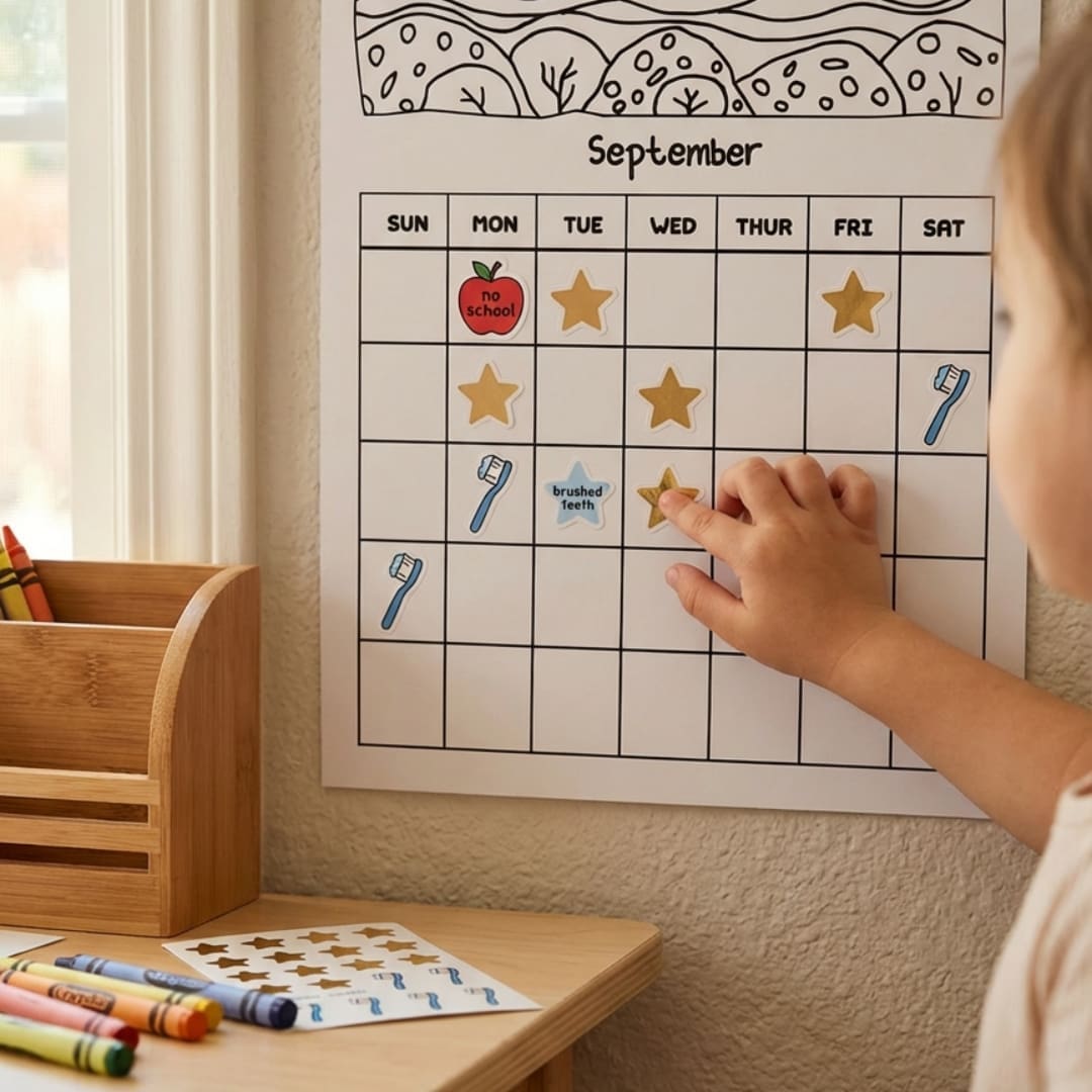 Lower half: A clear calendar layout with empty day spaces where children can stick notes or mini stickers to track activities, routines, and special moments