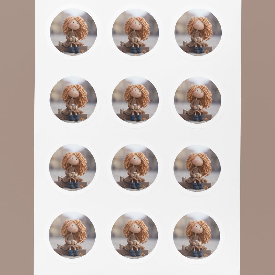 This Handmade-Inspired Collection of 11 Wool Doll Circle Stickers, a delightful collection inspired by soft handmade wool art. Each sticker captures the cozy magic of felted dolls, adorable little girls crafted in yarn-like textures, holding balloons, reading books, exploring nature, or celebrating the seasons.